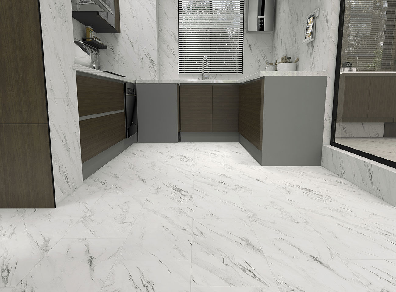 - Квадратная плитка: ПВХ плитка SPC квадратной формы, имитирующая керамическую плитку или камень.